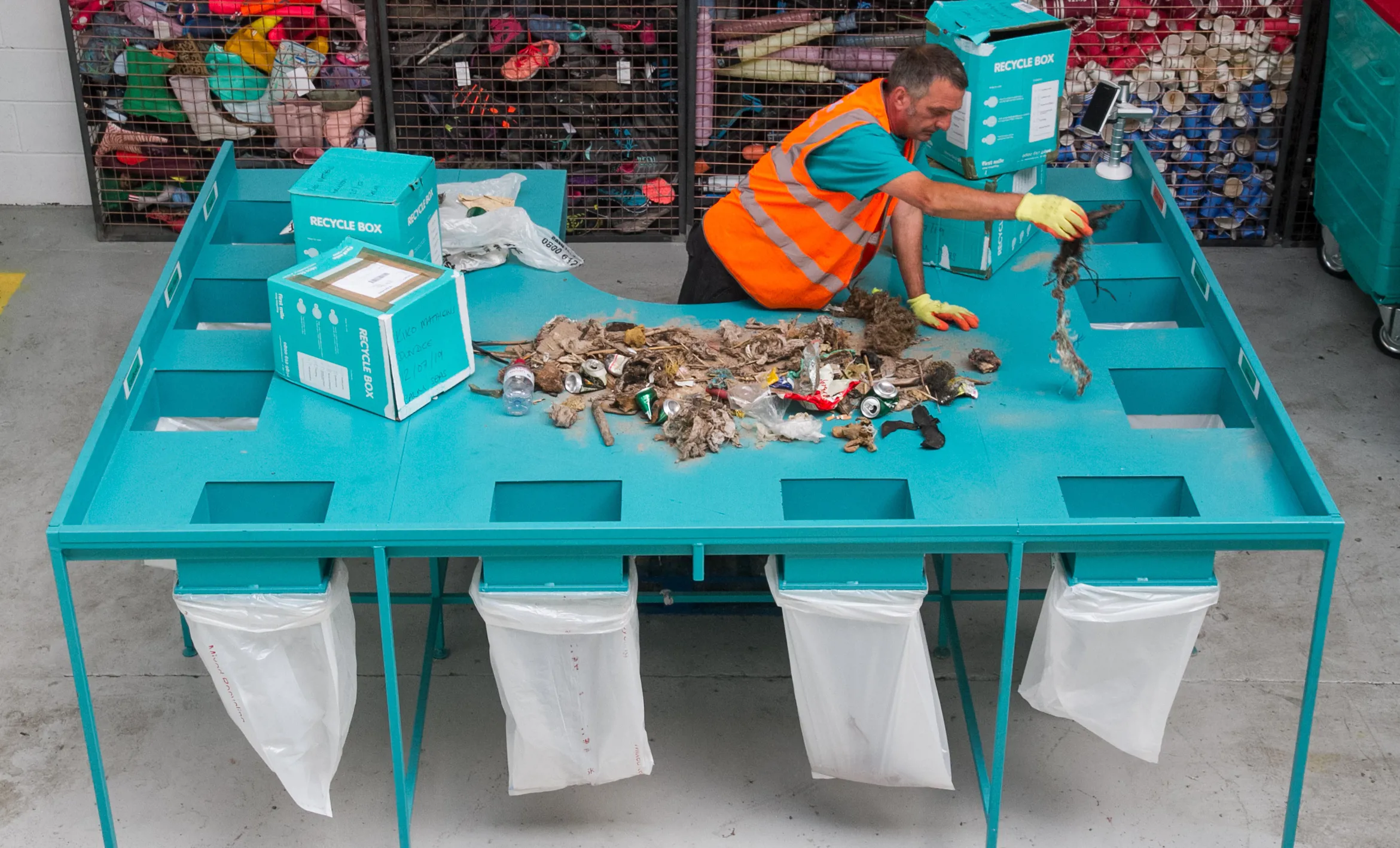 These boxes were filled with beach litter and sent back to First Mile’s innovative RecycleLab for analysis and data collection. Here, each box was emptied out onto First Mile’s bespoke audit table in the RecycleLab, where its contents were sorted into different material types, which were then weighed and identified as either recyclable or non-recyclable.