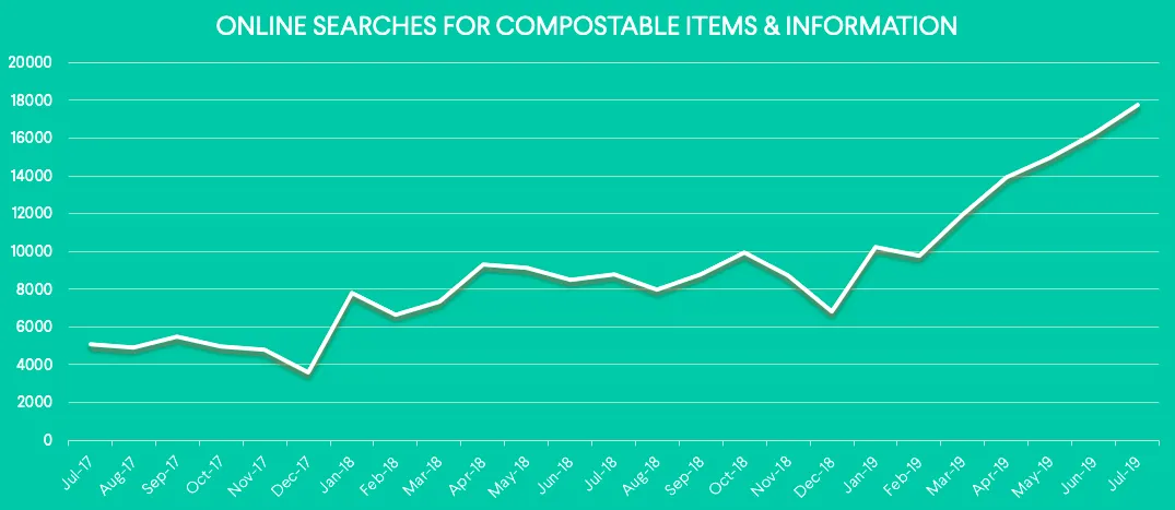 A quick look at Google’s data reveals a sharp increase in search demand for terms relating to compostable materials in the past two years. Amongst the most-searched-for are ‘compostable bags’, ‘compostable cups’ and ‘compostable plastic’. It shows not only a growth in public awareness, but also that consumers are actively looking for greener options.